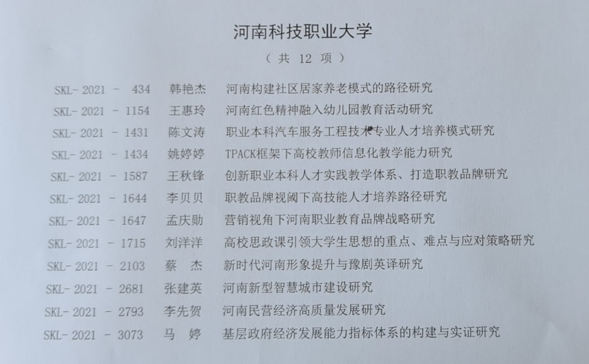 经专家评审,我校12项在2021年河南省社科联成功立项,具体名单如下: