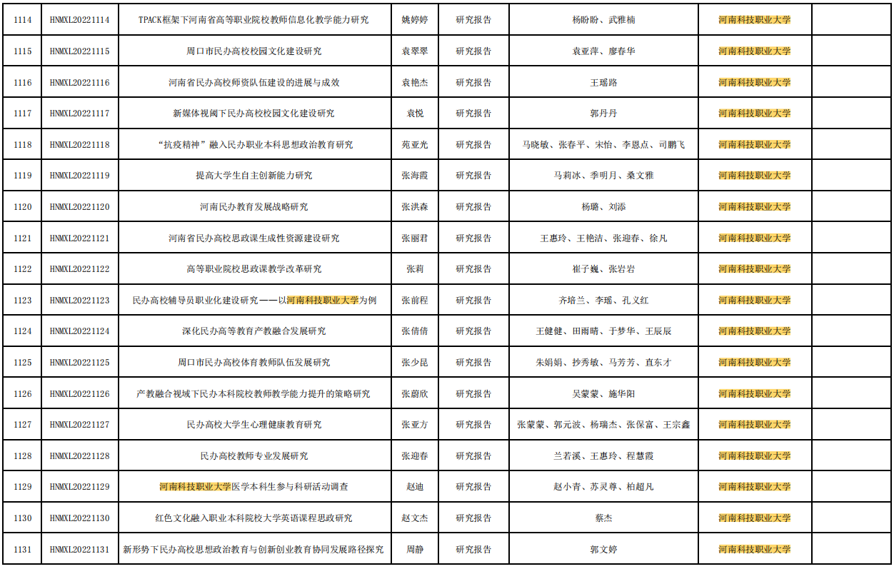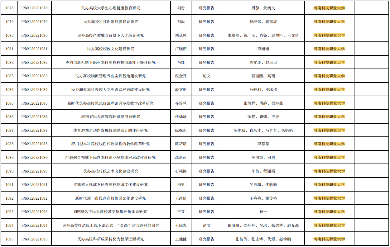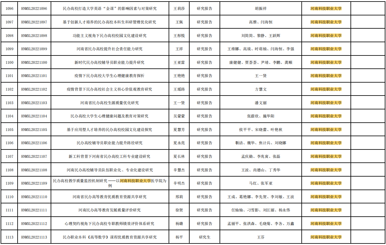 河南省民办教育协会2022年度申报的课题经专家评审,我校共有93项获准立项(名单如图)。请立项的老师根据《河南省民办教育协会2022年课题申报及2021年课题结项通知》要求准备结项。
