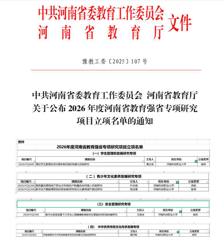 《中共河南省委教育工作委员会河南省教育厅关于公布 2026年度河南省教育强省专项研究项目立项名单的通知》豫教工委〔2025】107号 文件现已发布,我校共有5项研究项目获批立项(其中资助类1项、指导类4项)项目主持人分别是:叶志琪(资助专项)夏永亮(指导专项)张迎春(指导专项)王艳洁(指导专项)戴丹璐(指导专项),各课题组应继续深入开展研究,把握时间节点,并严格按照文件要求提交结项材料。