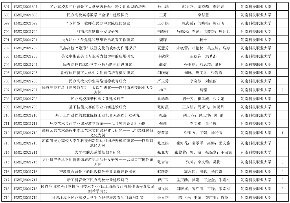 根据河南省民办教育协会《关于2020年度课题结项评审结果的通知》,我校50项河南省民办教育协会年度课题顺利结项。结项名单请详见附件:河南省民办教育协会2020年度课题结项评审一览表(2021年7月6日).pdf