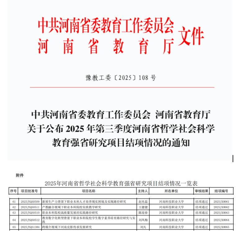 《中共河南省委教育工作委员会 河南省教育厅 关于公布2025年第三季度河南省哲学社会科学教育强省研究项目结项情况的通知》豫教工委〔2025〕108号文件已正式下发。我校共有5项研究课题在第三季度顺利通过结项评审(项目主持人分别是:赵光磊、王健健、陈迎春、刘凤梅、刘凡)。