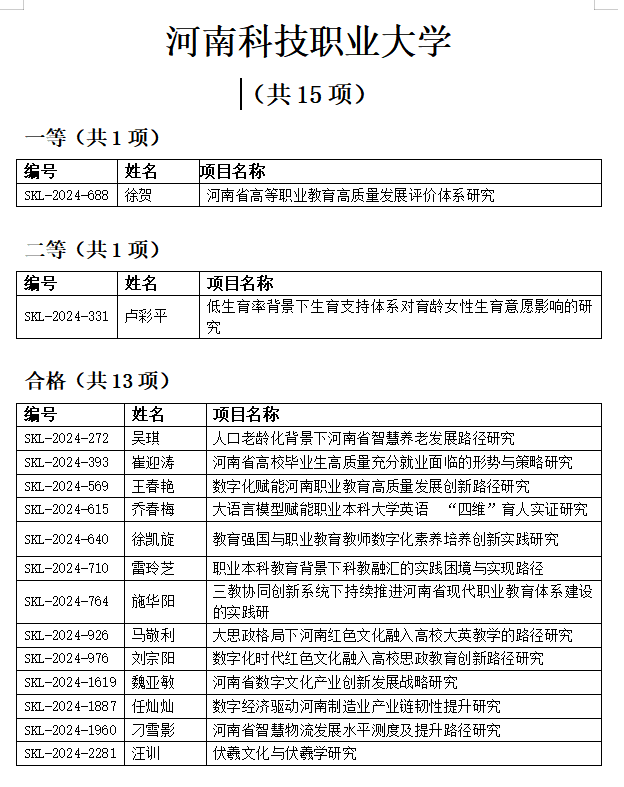 河南省社科联2025年调研课题结项中,我校15项课题顺利结项(其中一等奖1项、二等奖1项),课题负责人分别是:徐贺(一等奖)、卢彩平(二等奖)、吴琪、崔迎涛、王春艳、乔春梅、徐凯旋、雷玲芝、施华阳、马敬利、刘宗阳、魏亚敏、任灿灿、刁雪影、汪训。
