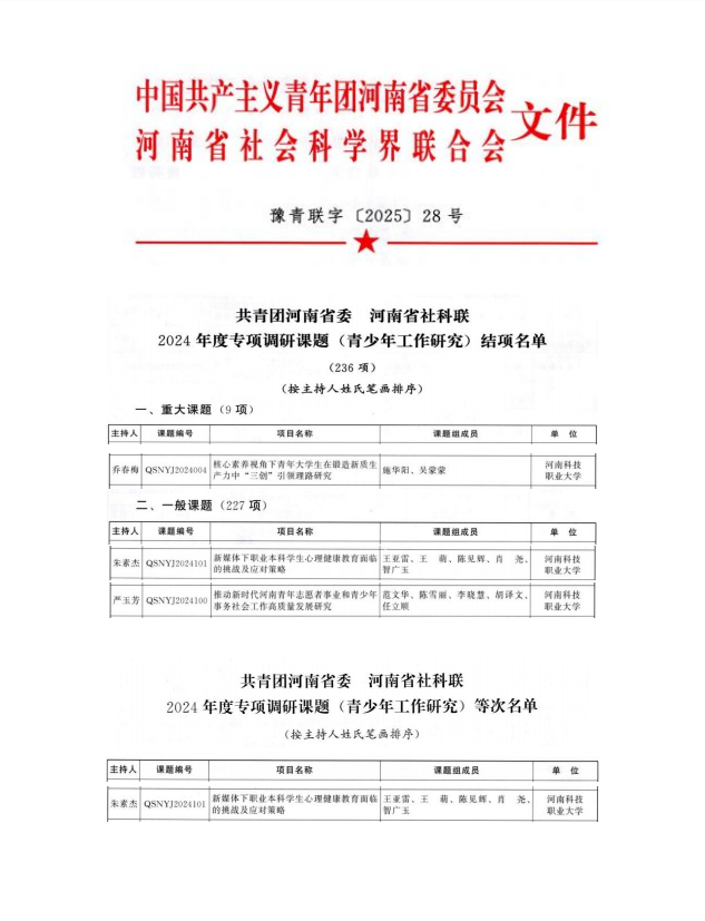 《共青团河南省委 河南省社科联关于公布2024年度专项调研课题(青少年工作研究)结项名单和等次名单的通知》现已发布,我校共有3项课题获批结项: